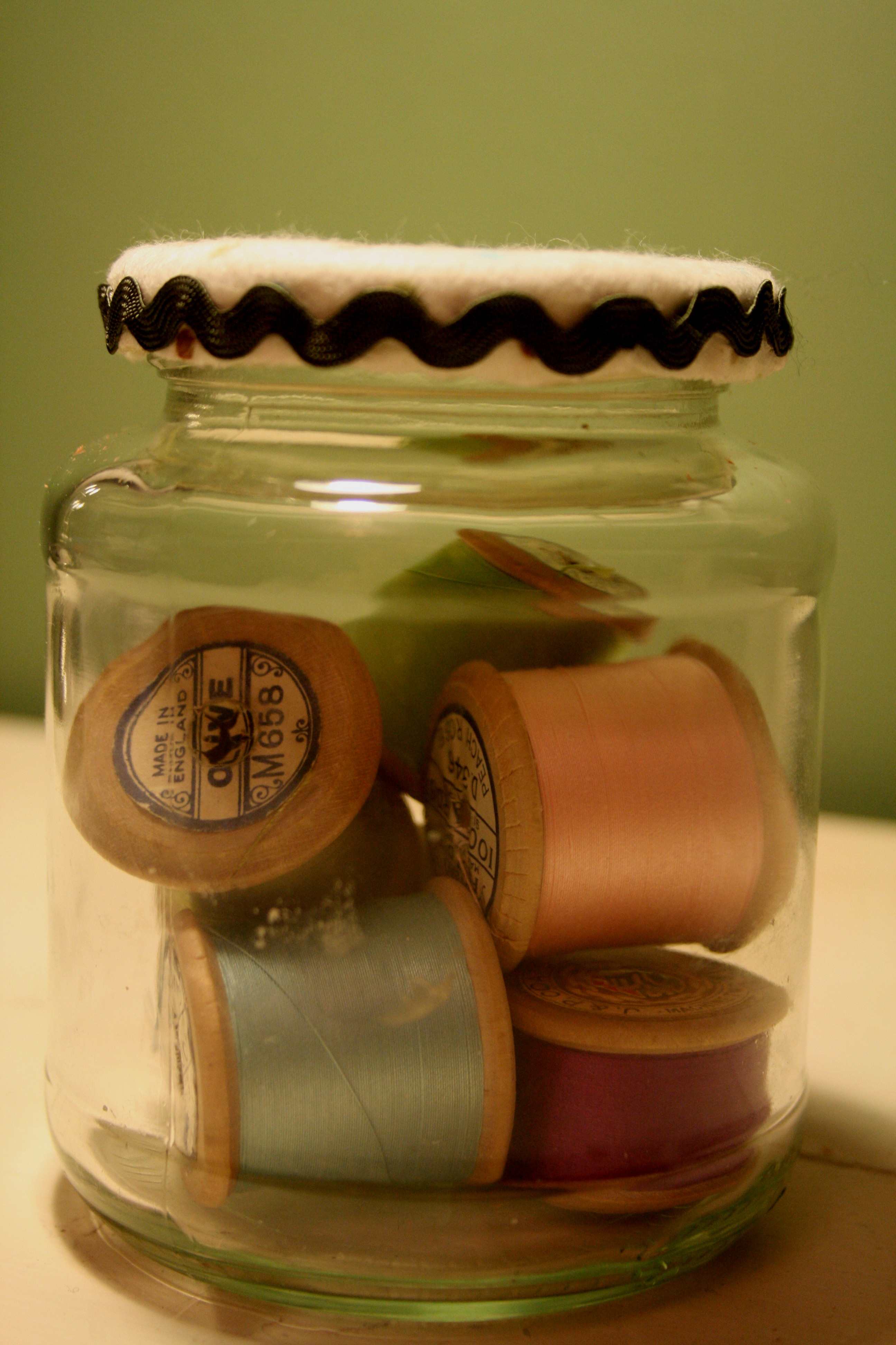 […] of cotton reels when we visited once as she no longer uses them and I have them displayed in an upcycled jam jar on my […]