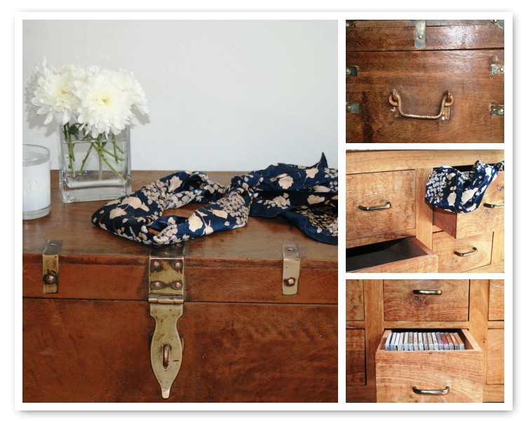 We found the chest from an antique shop near Hampton Court Palace in West London and it now lives in our living room. The scarf on top was a find at Kempton, as was the wooden cabinet with drawers that you see above. That’s also in the living room and is a replacement for our TV stand which fell apart when we moved house! The drawers are really useful for storing cds and other nick nacks.