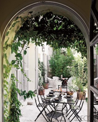 Ah French style gardens and dining. My ultimate favourite. I’m hoping to take the main elements of this design and recreate something similar in our garden. Lots of white, green plants and a simple, elegant black set of garden furniture. Sigh.