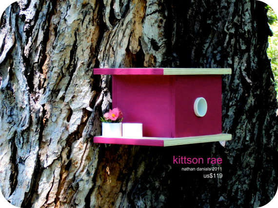 This modern pink birdhouse. How cute? It’s even got a small flower in a pot outside!