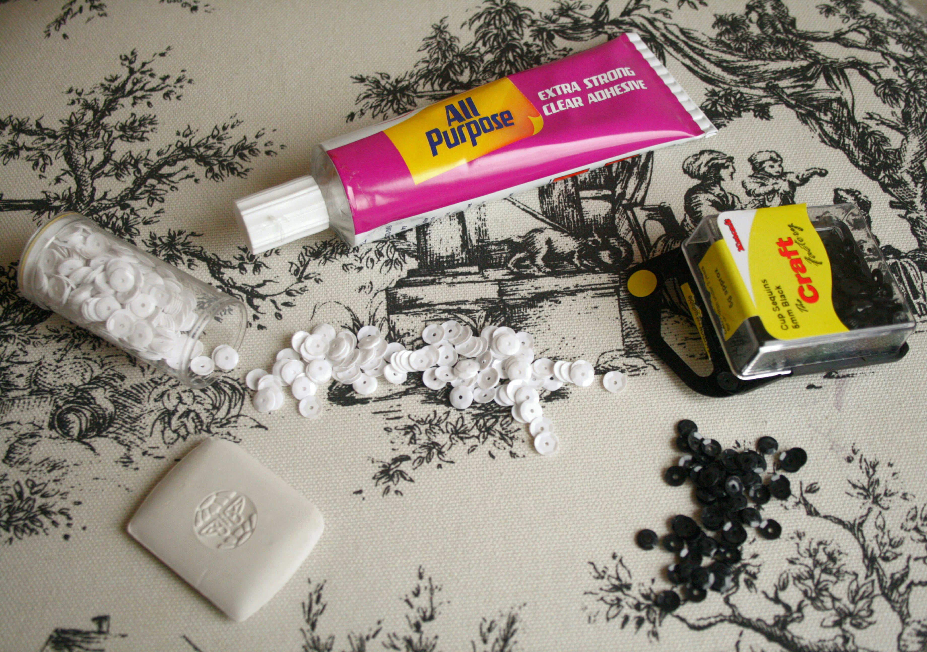 Next I gathered all my resources. You will need some black and white sequins, tailor’s chalk so that you can mark out your chevrons and some strong glue. I used Bostik glue. Make sure you use something that dries clear so that you don’t get a coloured residue on your sequins.