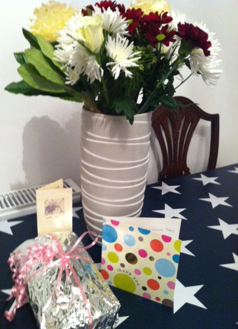 Some friends of ours from church got together and arranged for one of them to drop us round cards, flowers and some gorgeous banana cake as a surprise gift, to let us know they are thinking of us and praying for us. We’ve had a bit of a tough time recently in the Celebrate Creation household and it meant so much to receive this out of the blue one evening. If you are considering doing something similar for someone you know who is suffering at the moment may I encourage you to go ahead? It means so much to know that people are thinking of you and lending their support.