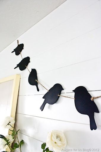 I spied this garland over on Pinterest the other day and immediately saved it to my DIY board. I think that this would be a pretty easy to make – just some thick black card and string required. You could even make the birds out of thin plywood and paint them with blackboard paint. Actually, a chalky pastel paint would be nice…