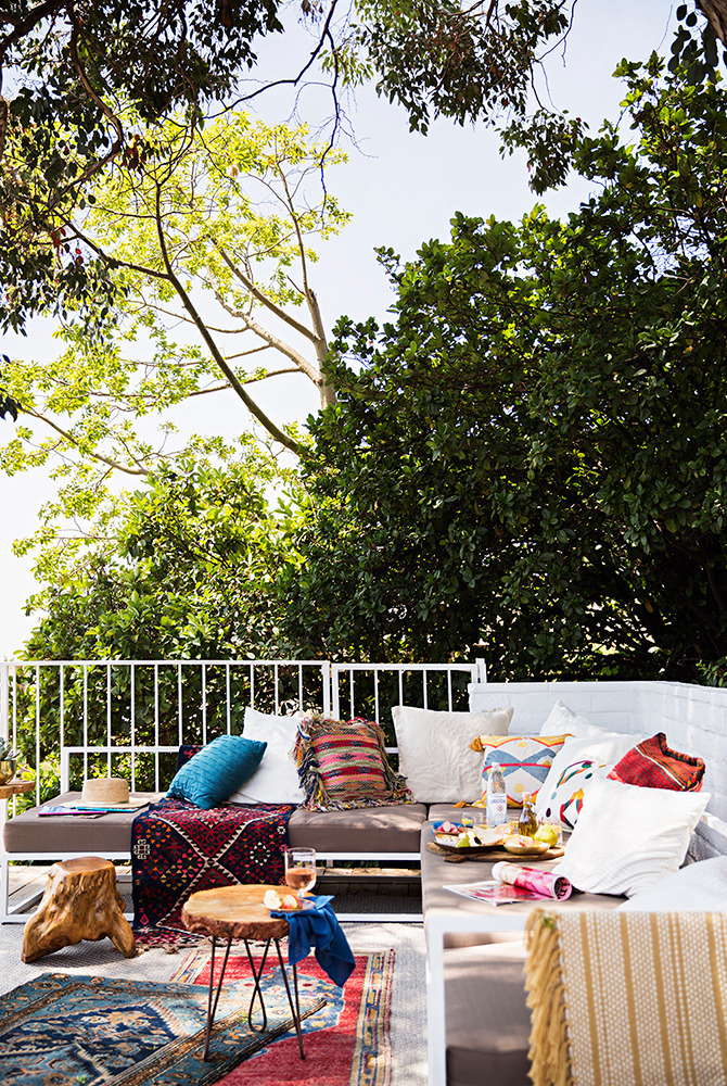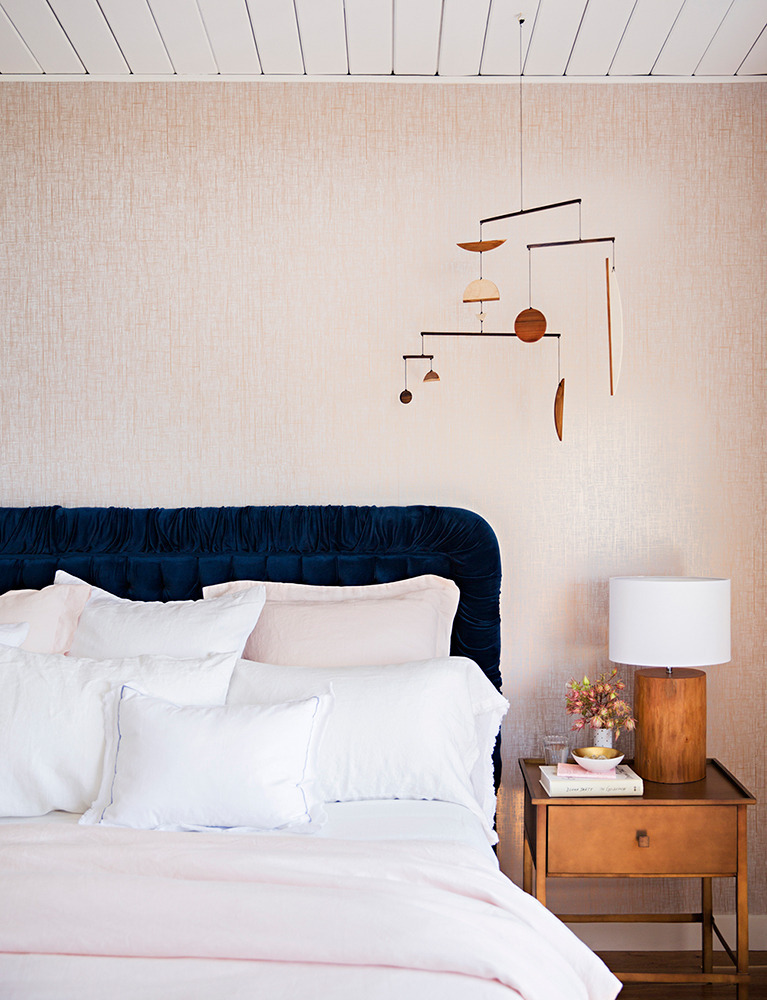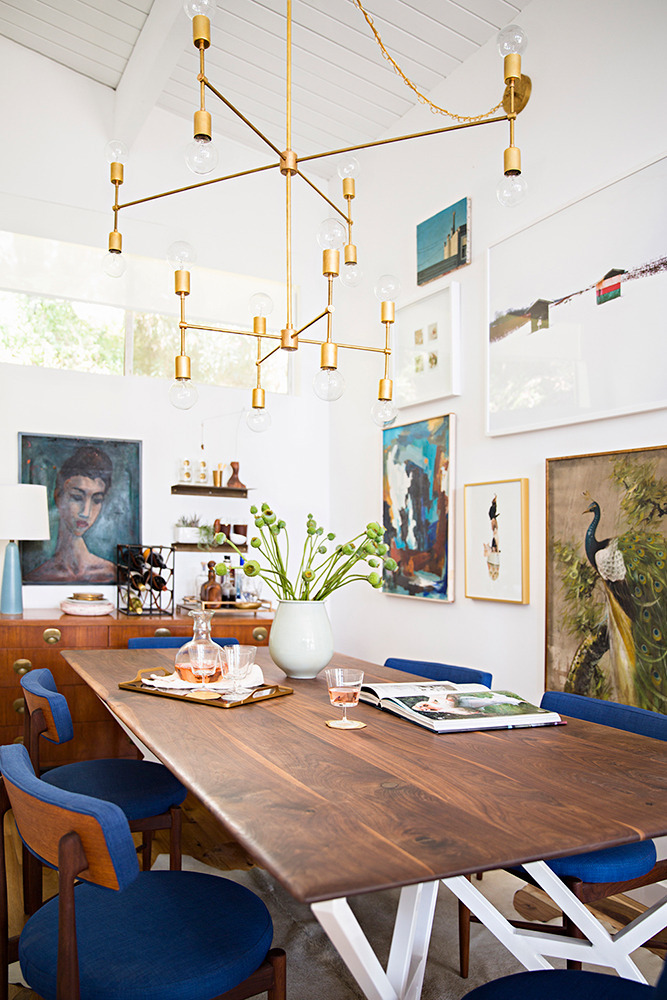 As an interior designer, stylist and HGTV host, one would expect the home of Emily Henderson to be well curated, beautiful and inspiring. It is. A white base creates a sophisticated backdrop on which to house feature accents of navy, textured wood and gold. Interesting visual points are created with asymmetric ceiling mobiles and rather lovely bookshelves divided through the middle to create irregular quadrilaterals in which to display books and accessories. Need I continue? Take a peek for yourself.