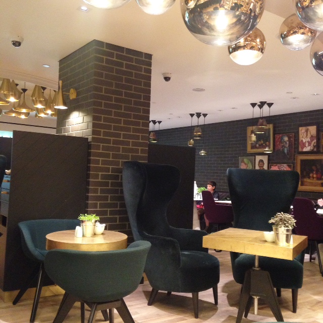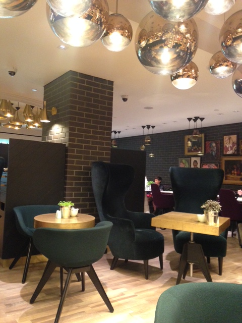 I absolutely love the colour palette for this cafe. Moody greens, navy and purple create a luxurious atmosphere whilst the gold accents add to the indulgence of the space. This is then juxtaposed against exposed brickwork on the walls which adds an industrial feel. We sat in two of the green winged chairs you can see above and ate sandwiches and drank tea.