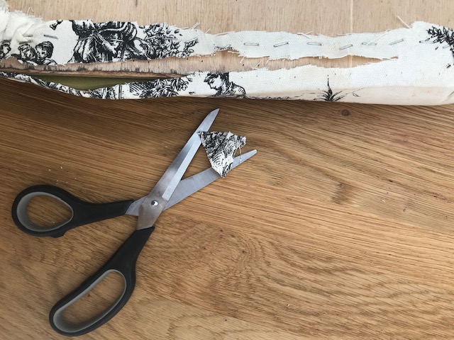It was really, really tricky to get all of the staples out as they had been stapled very close together and straight down instead of at an angle. Therefore after removing the hessian backing, I decided to cut the fabric off the seat pad as close to the staples as possible instead of removing each staple.