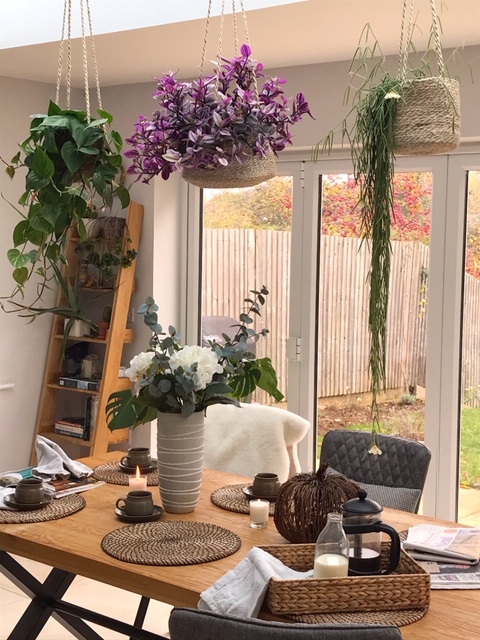 We hung the plants by attaching tension wire between the two joists of the roof lantern and then secured the baskets to them. It works really well as the wire is hidden from sight most of the time due to the structure of the roof. It’s also pretty thin tension wire and so not an ugly eyesore! I’m looking forward to seeing what else I can hang form there this Christmas. I’m thinking of hanging baubles and some large paper decorations. I’ll let you know how it turns out!