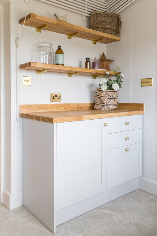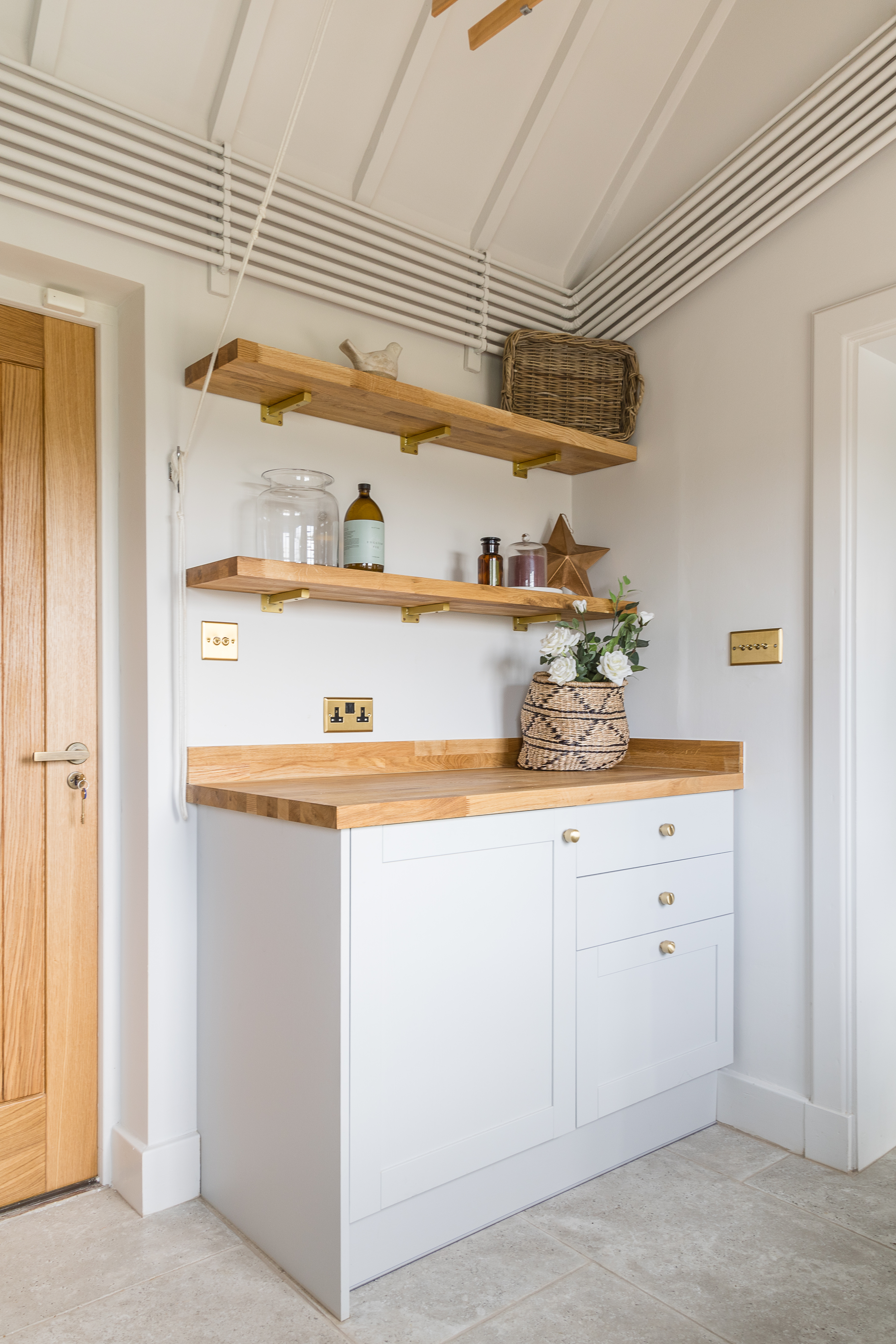 We added a calming pop of colour to the back storage cupboards by painting them in Little Greene’s ‘Livid’ and complemented the shade with off grey cabinets throughout the rest of the utility room. Warmth and depth of tone were added throughout via brushed gold handles and natural wooden shelves, all carefully constructed by Reuben Fish, carpenter and owner of Woodstock CJ, in Kent. I added some task lighting via some beautiful wall lights from Jim Lawrence, whilst texture and a complementary pop of colour were added through the bespoke roman blinds.
